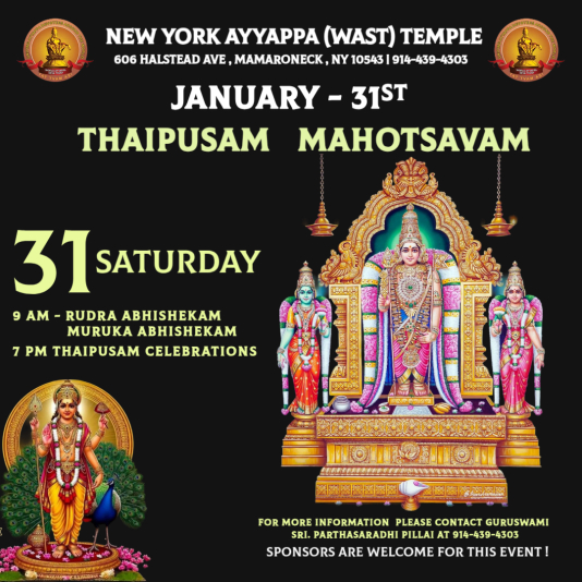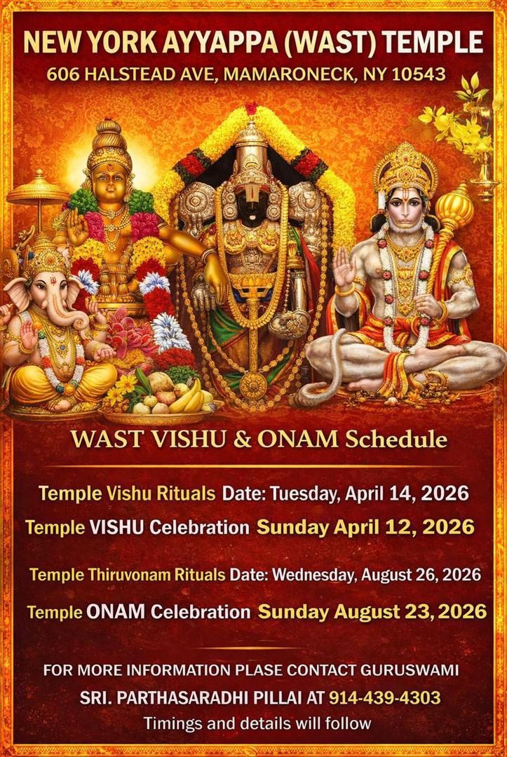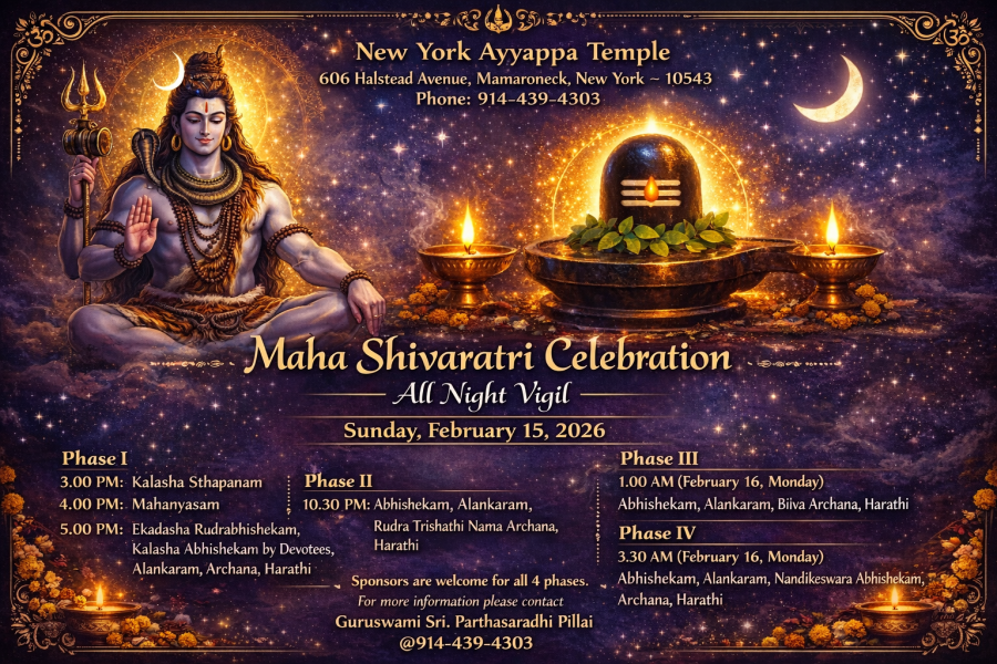 World Ayyappa Seva Trust (WAST INC.), a non-profit public charity organization, was founded by honorable Guruswami Parthasaradhi Pillai in 1988. Today, WAST has evolved to become the largest Ayyappa devotee organization in the world only because of its utmost devotion, dedication, authentic style of poojas and Bhajans and un-matched charitable services. Over 30 years, Guruswami has been leading Lord Ayyappa bhajans across the nation, taking pilgrims from U.S to Sabarimala, conducting Karkkidaka vavu bali, Hindu Funeral services, Hindu Weddings and hosting Sapthahams. The most important WAST’s accomplishments include introduction of Lord Ayyappa Rituals, Mandala Pooja, Ramayayan and Bhagvatha chanting, Vishnu and Lalitha Sahsranamam and Makara Sankranthi.