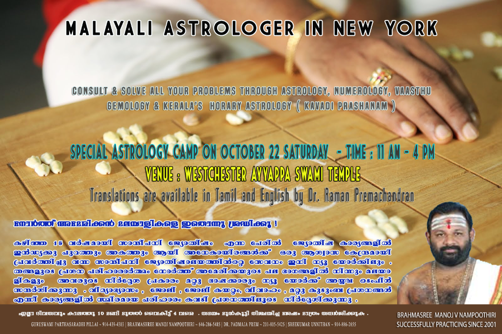 World Ayyappa Seva Trust offers Astrology services at the temple by WAST Temple Melshanthi Brahmasri Manoj Namboodiri. Consultations are available by appointment. Please contact Guruswami Parthasaradhi Pillai for appointment @914-439-4303 , 201-805-5425 , 914-886-2655 or 914-682-8400